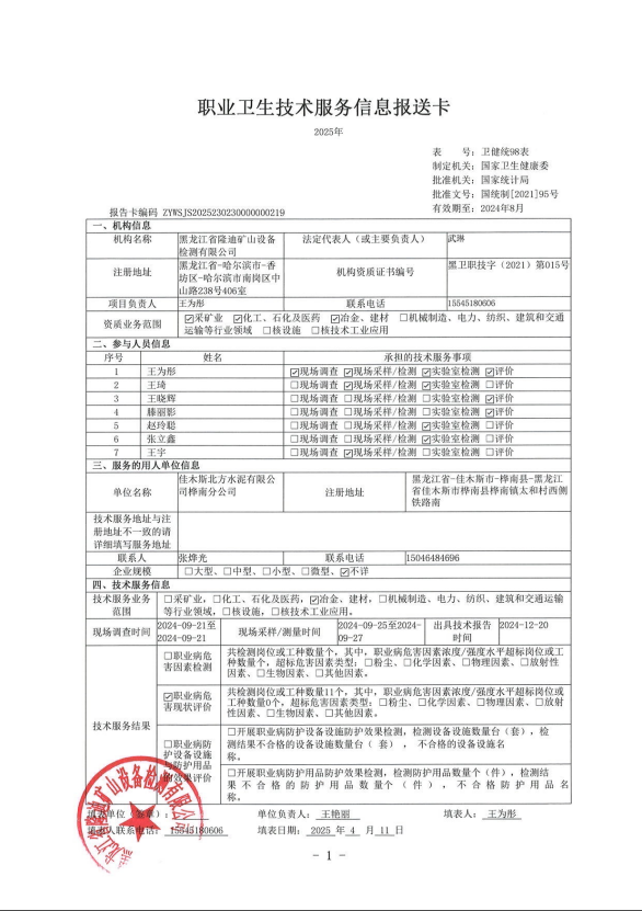 佳木斯北方水泥有限公司樺南分公司2#線職業(yè)病危害現(xiàn)狀評價